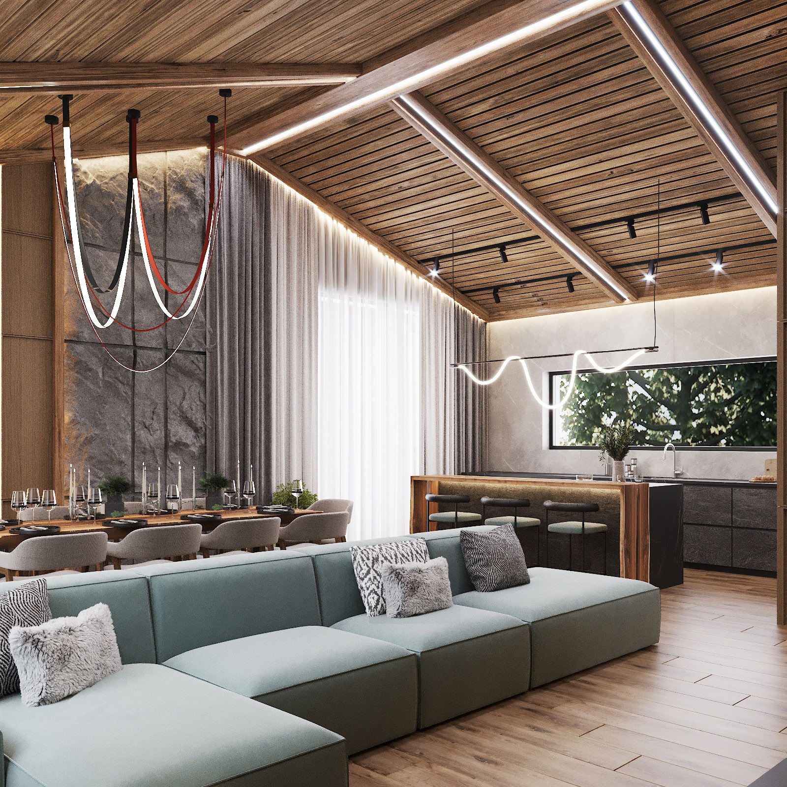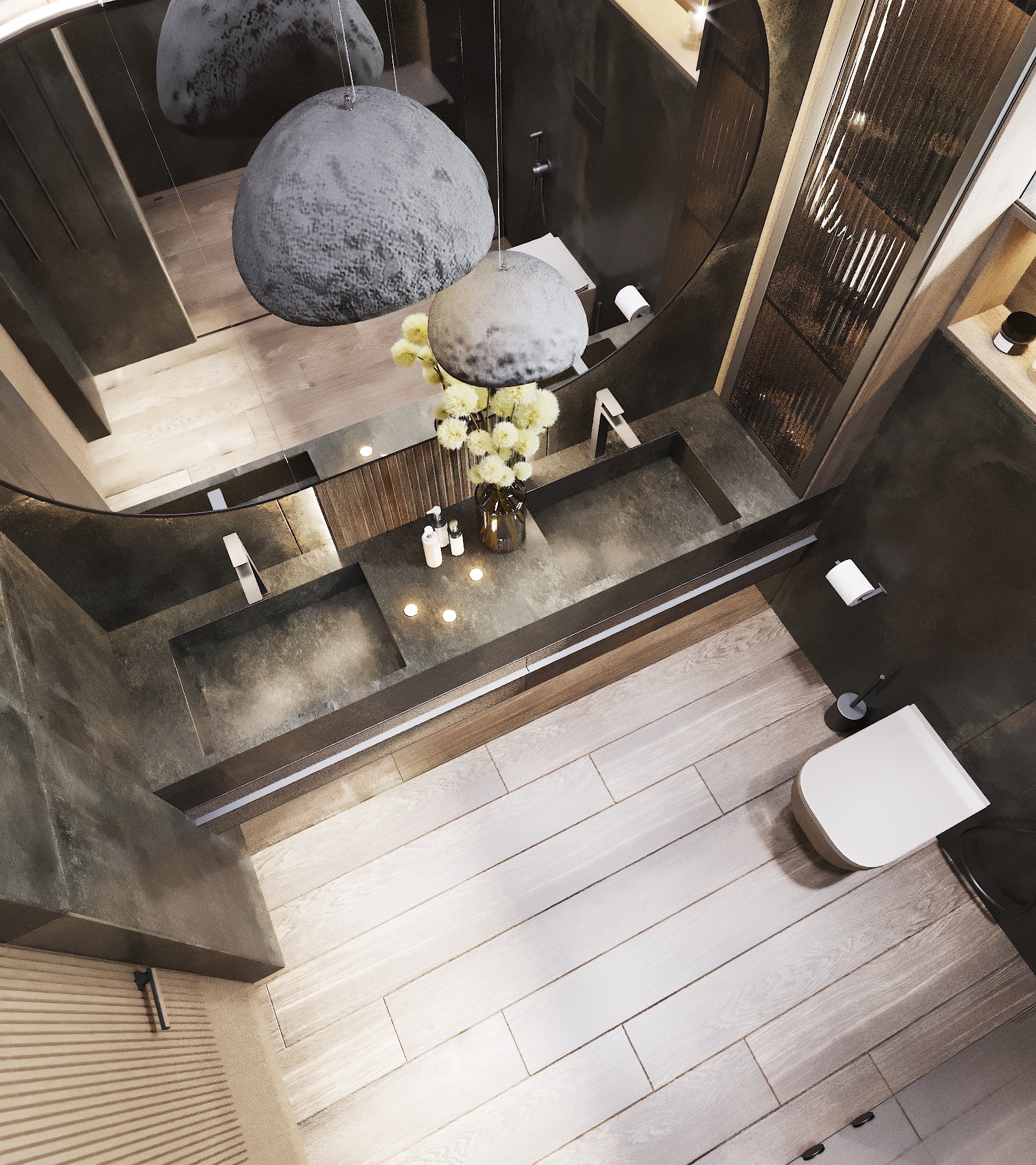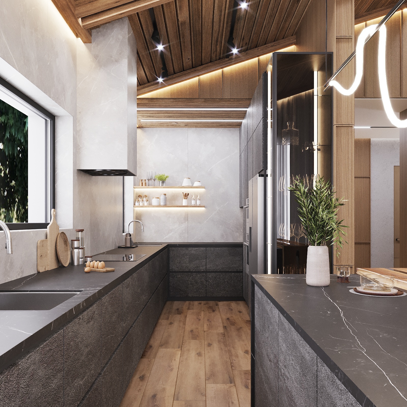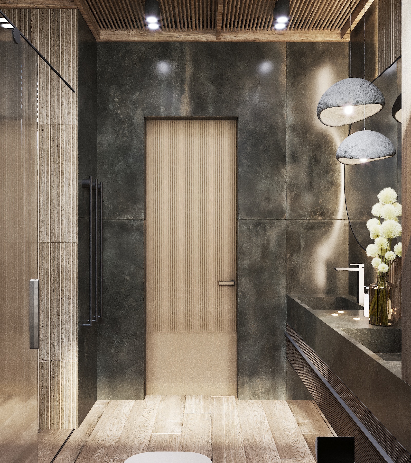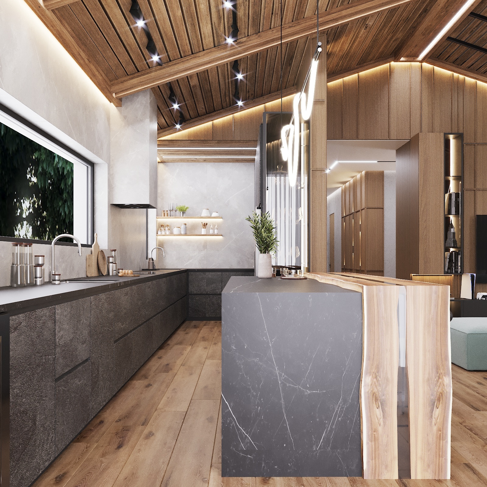 Кухня, гостиная, ванная, душевая с сауной, кабинет, коридор, 2 спальни, гардеробная