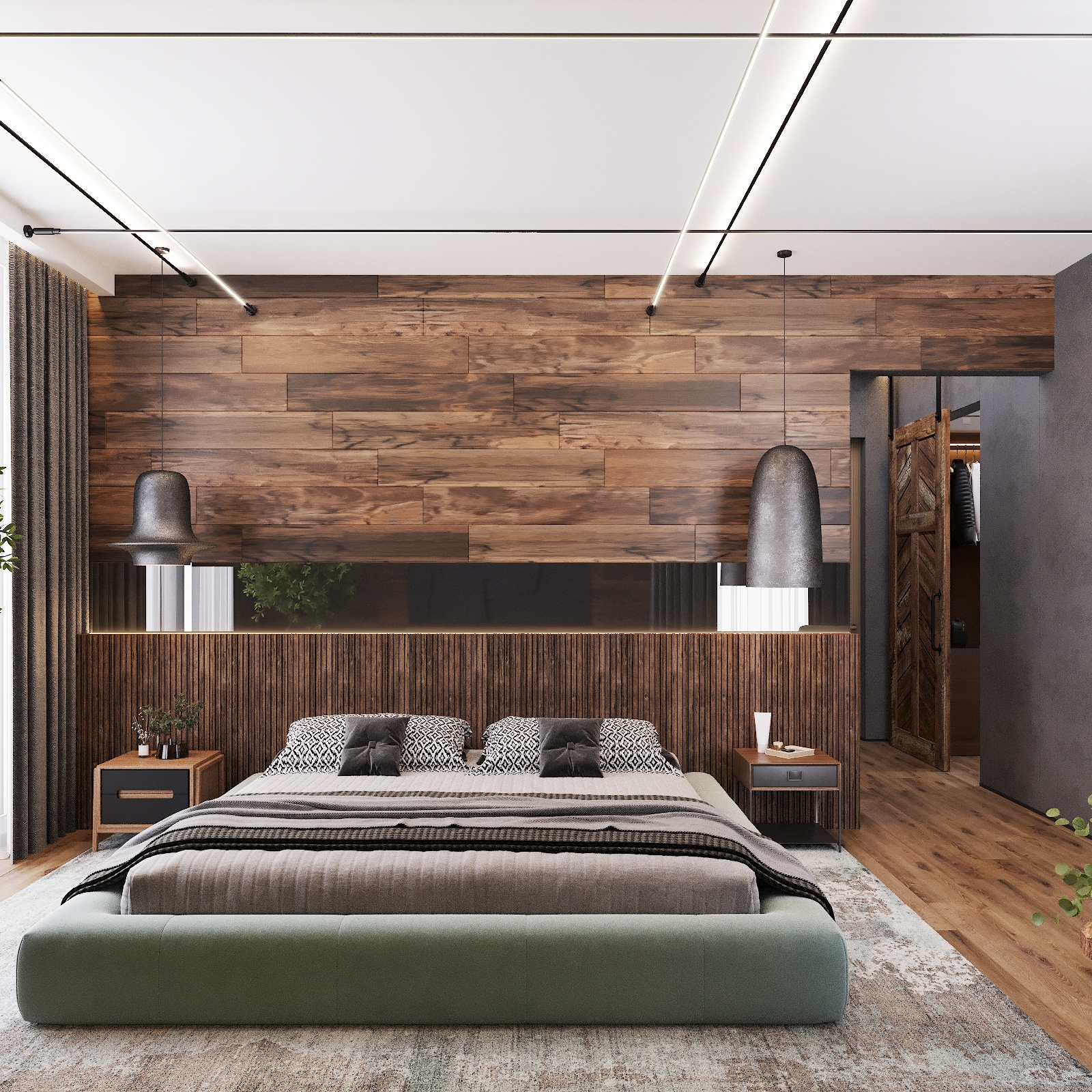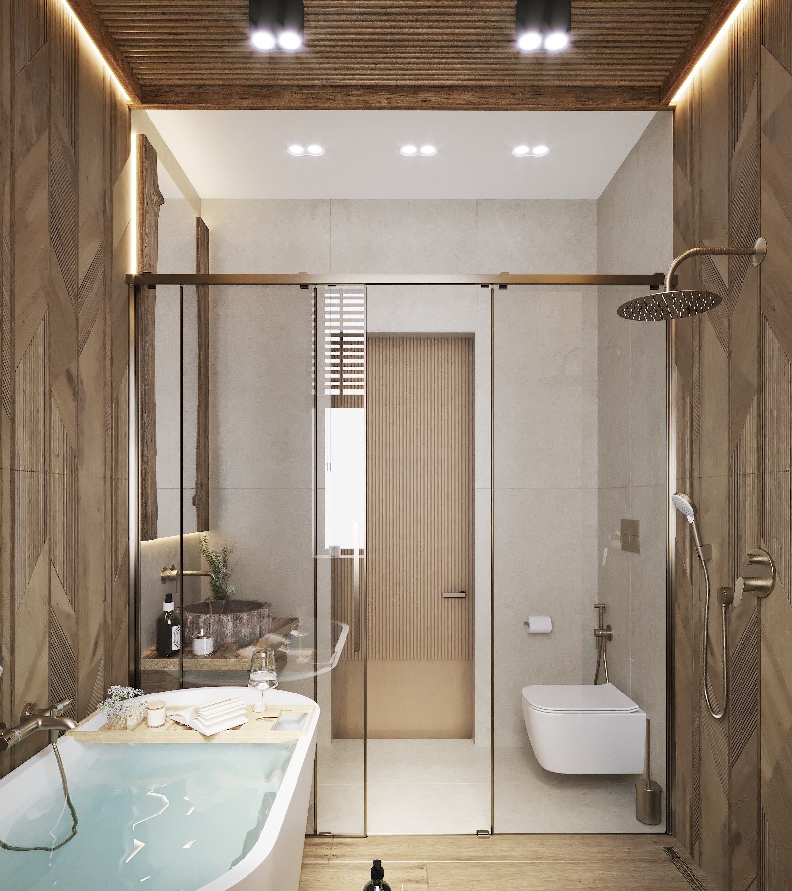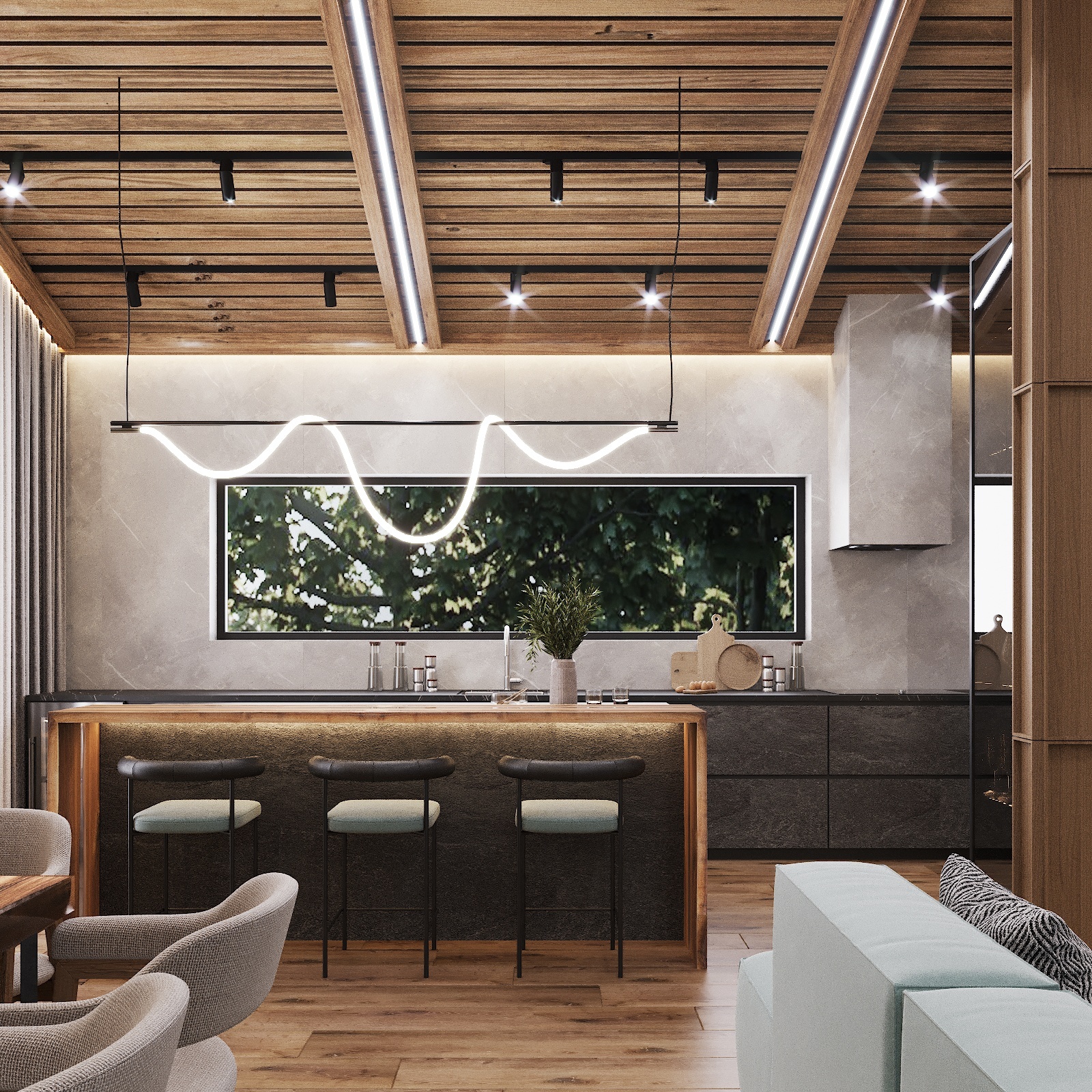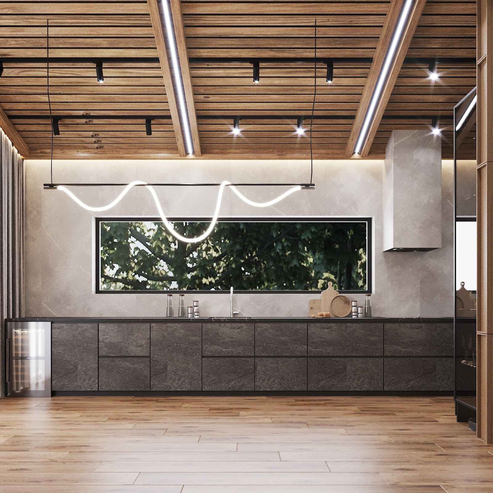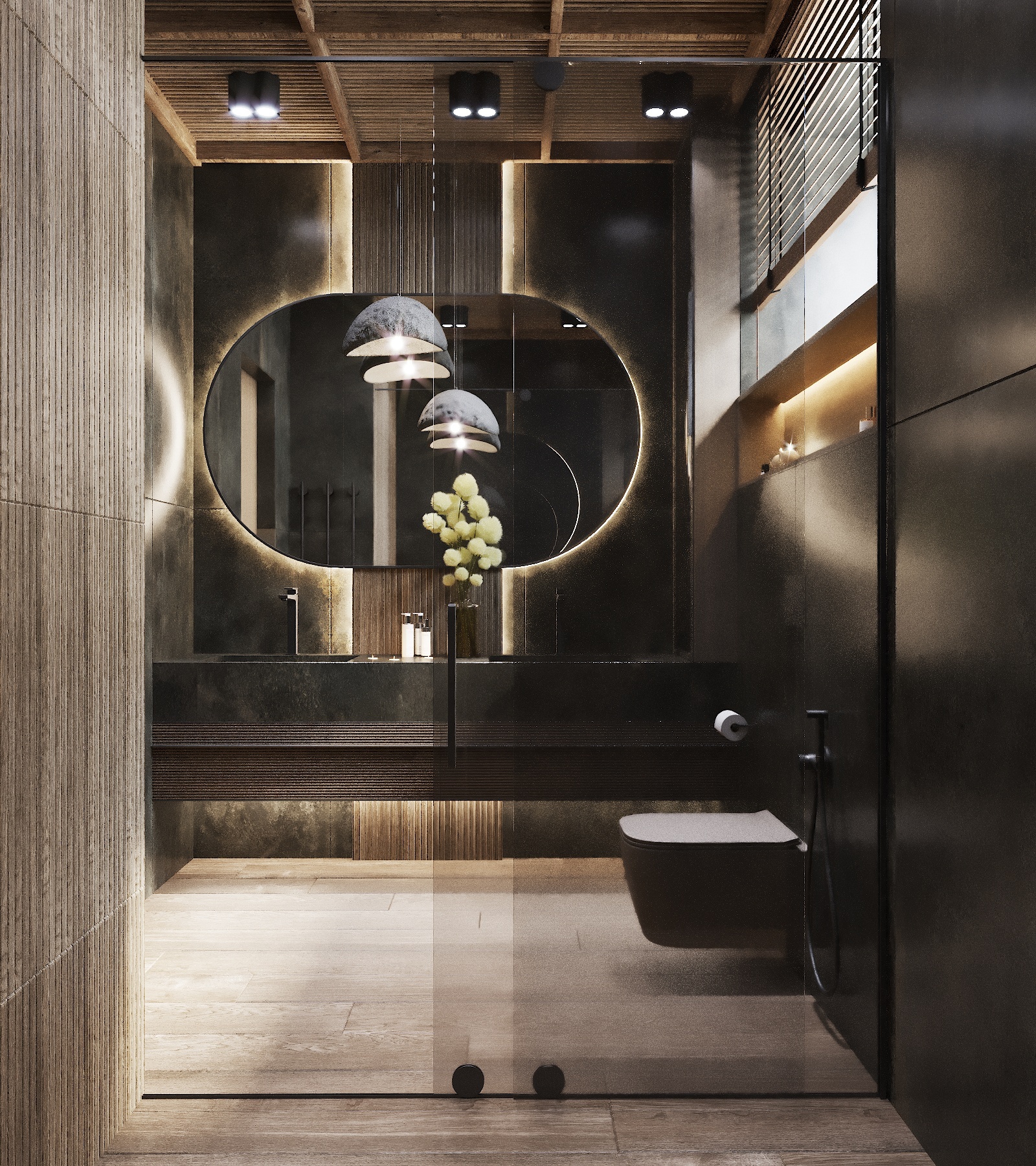 Кухня, гостиная, ванная, душевая с сауной, кабинет, коридор, 2 спальни, гардеробная