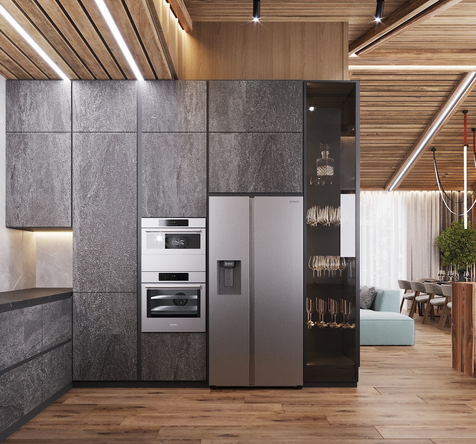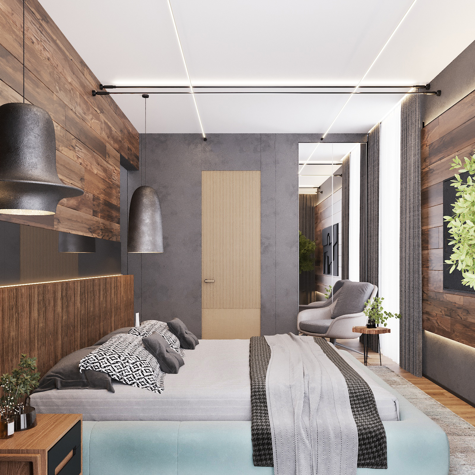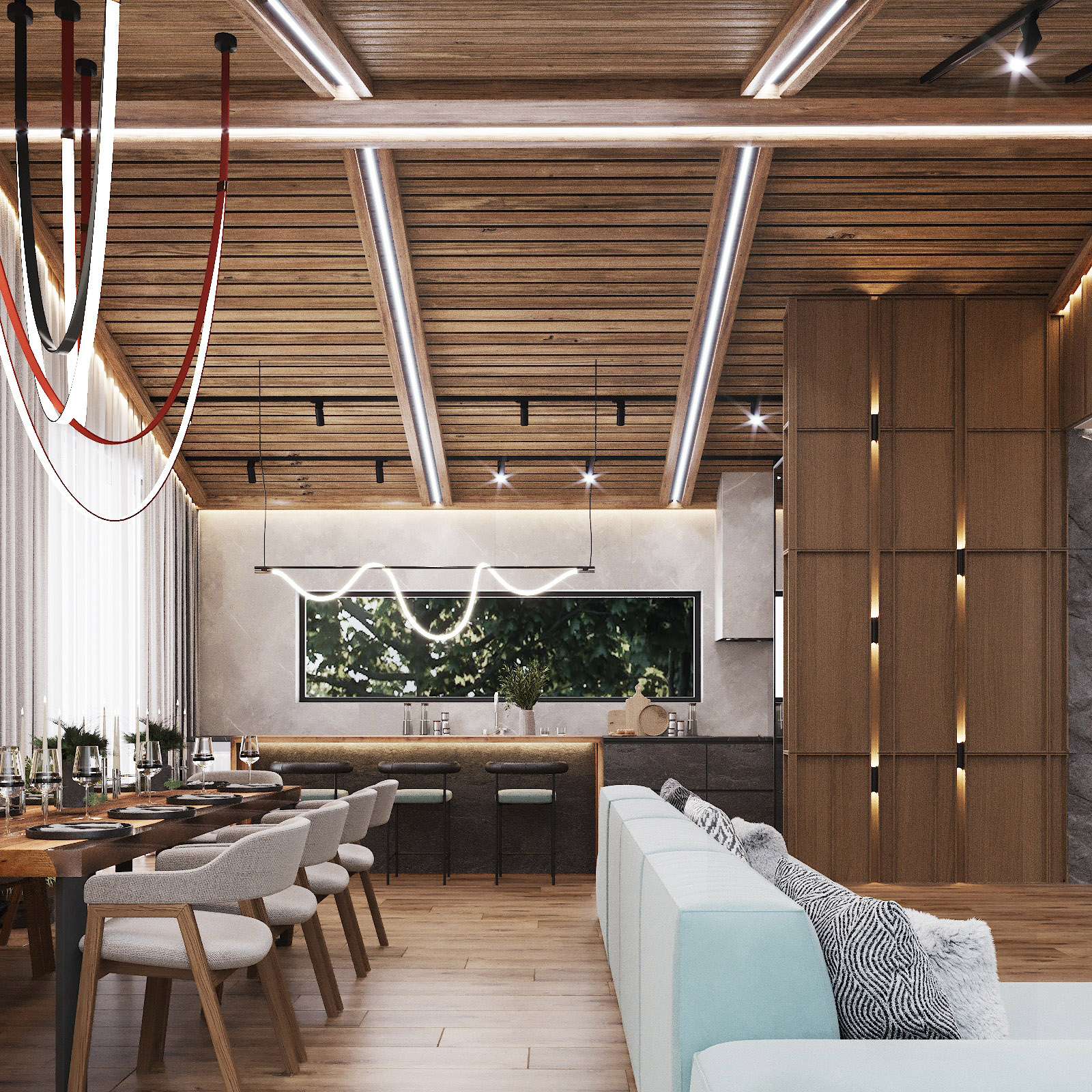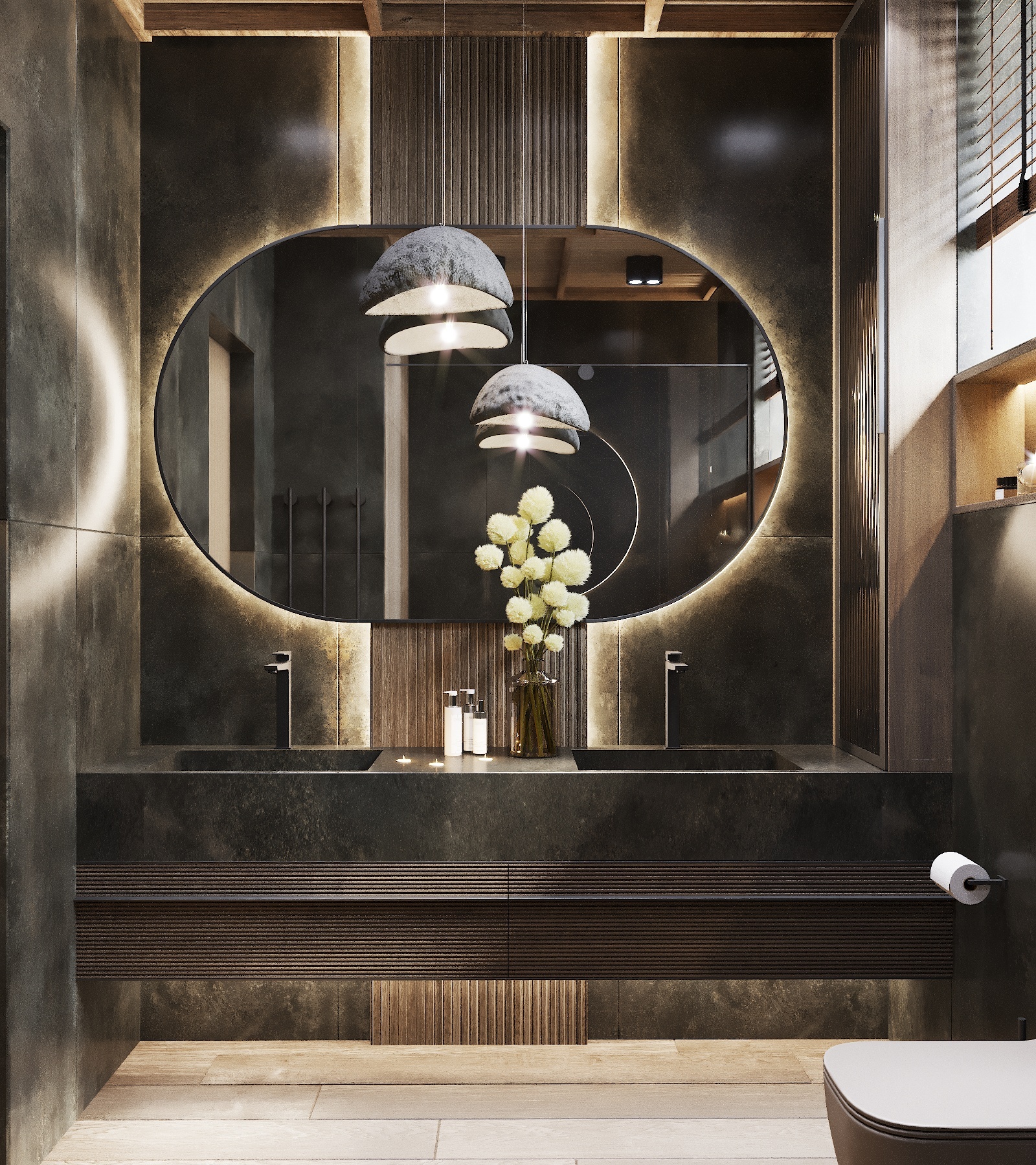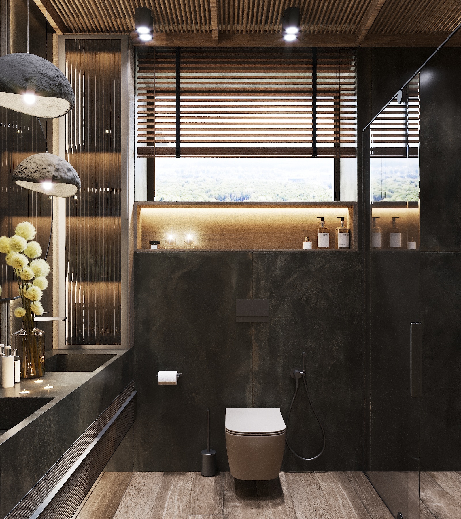 Кухня, гостиная, ванная, душевая с сауной, кабинет, коридор, 2 спальни, гардеробная