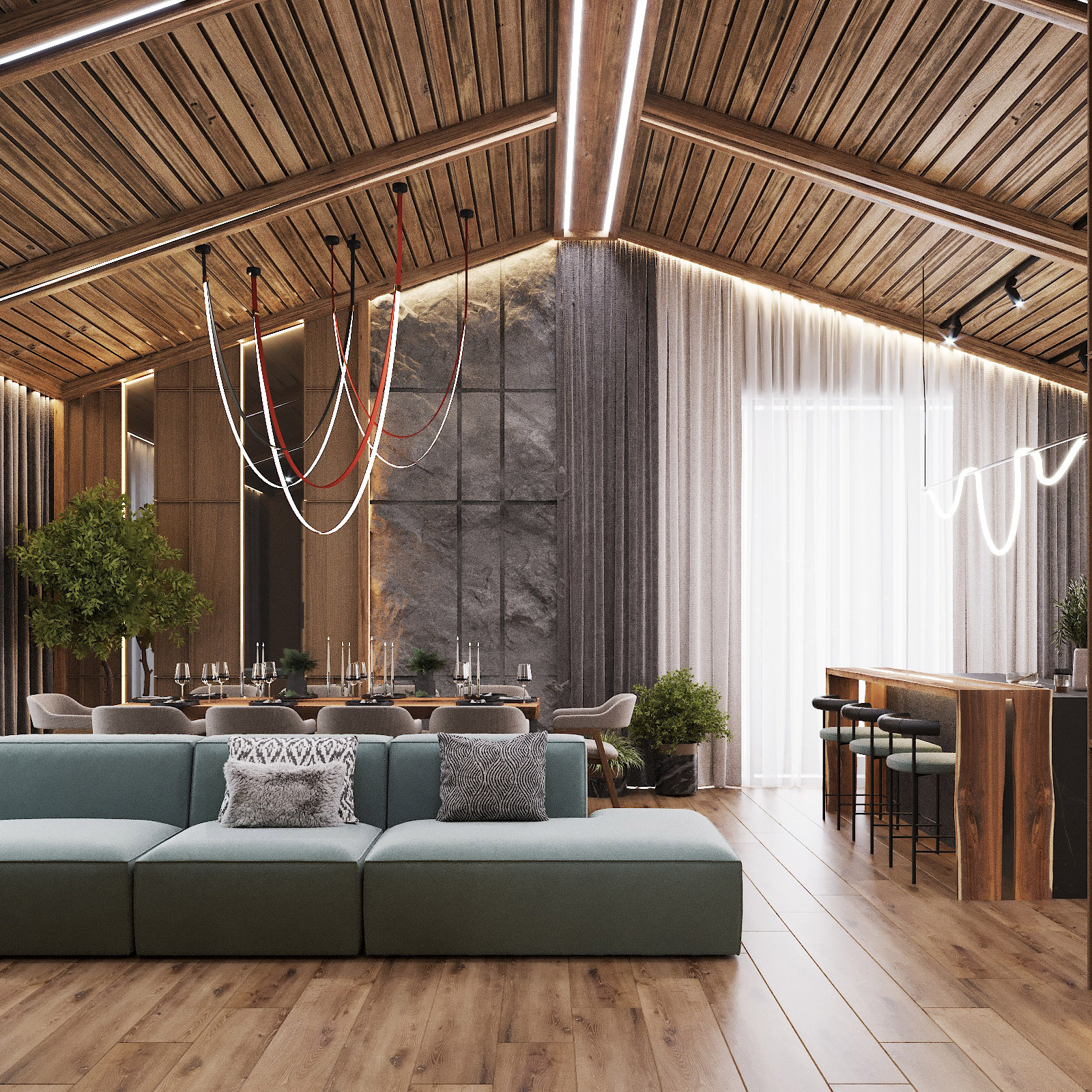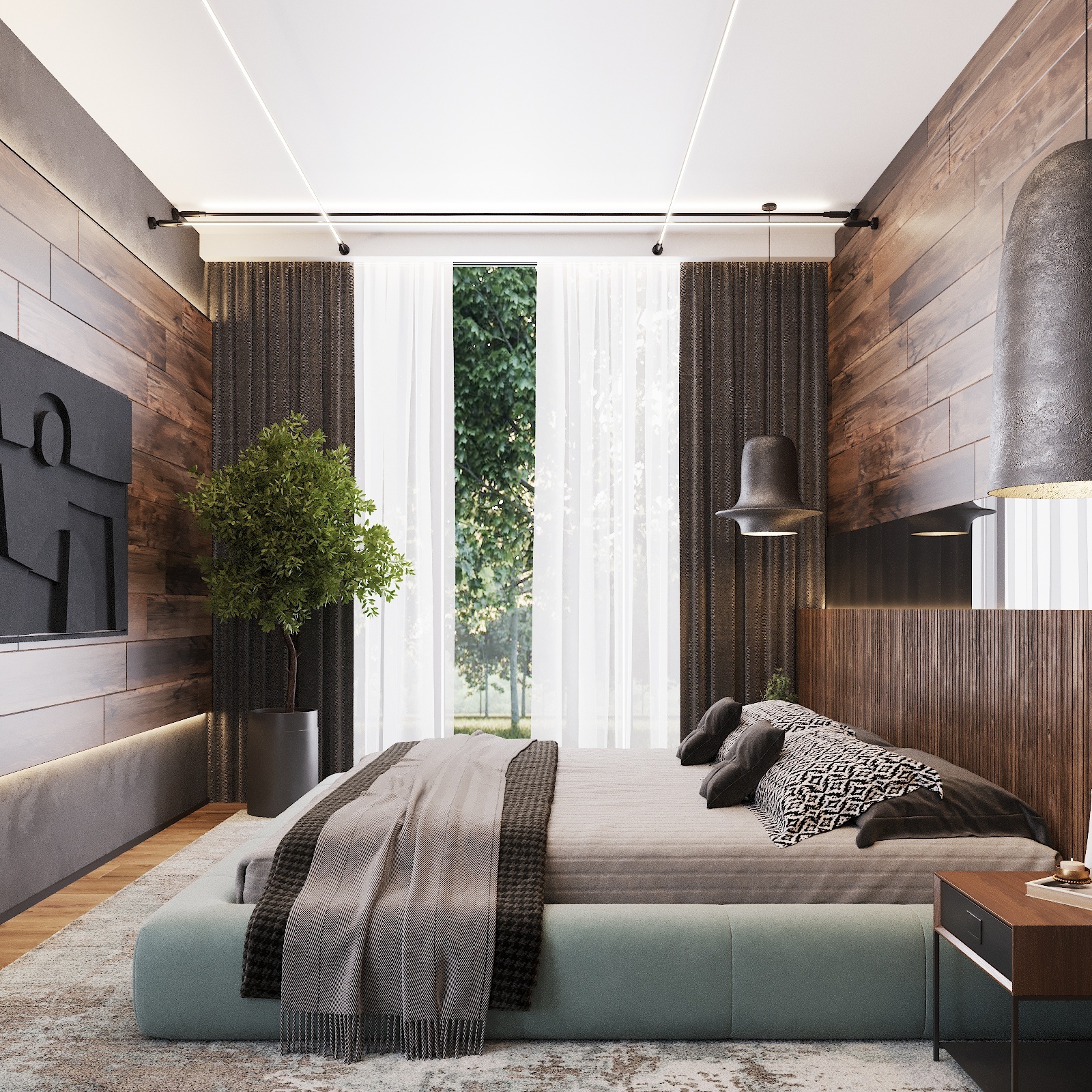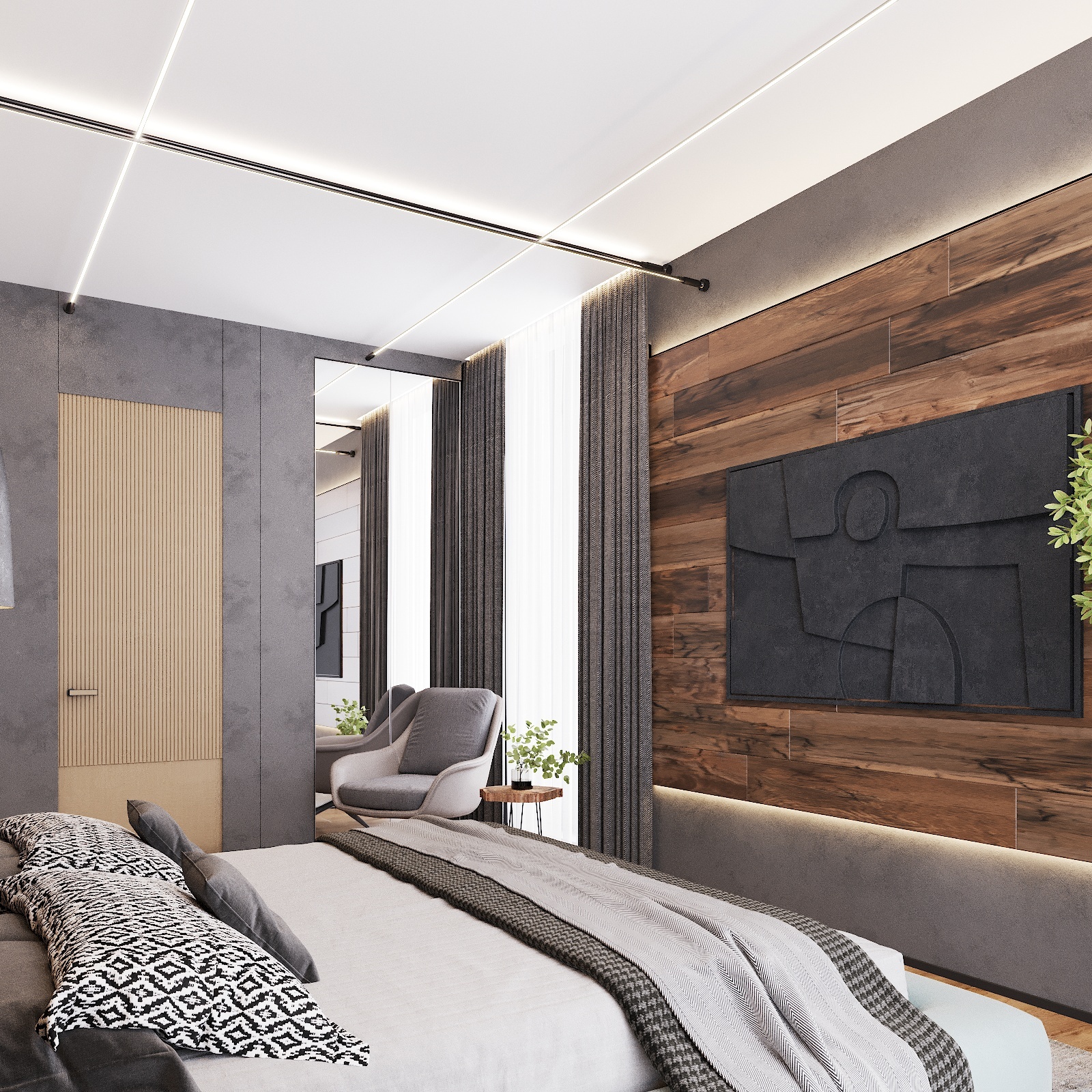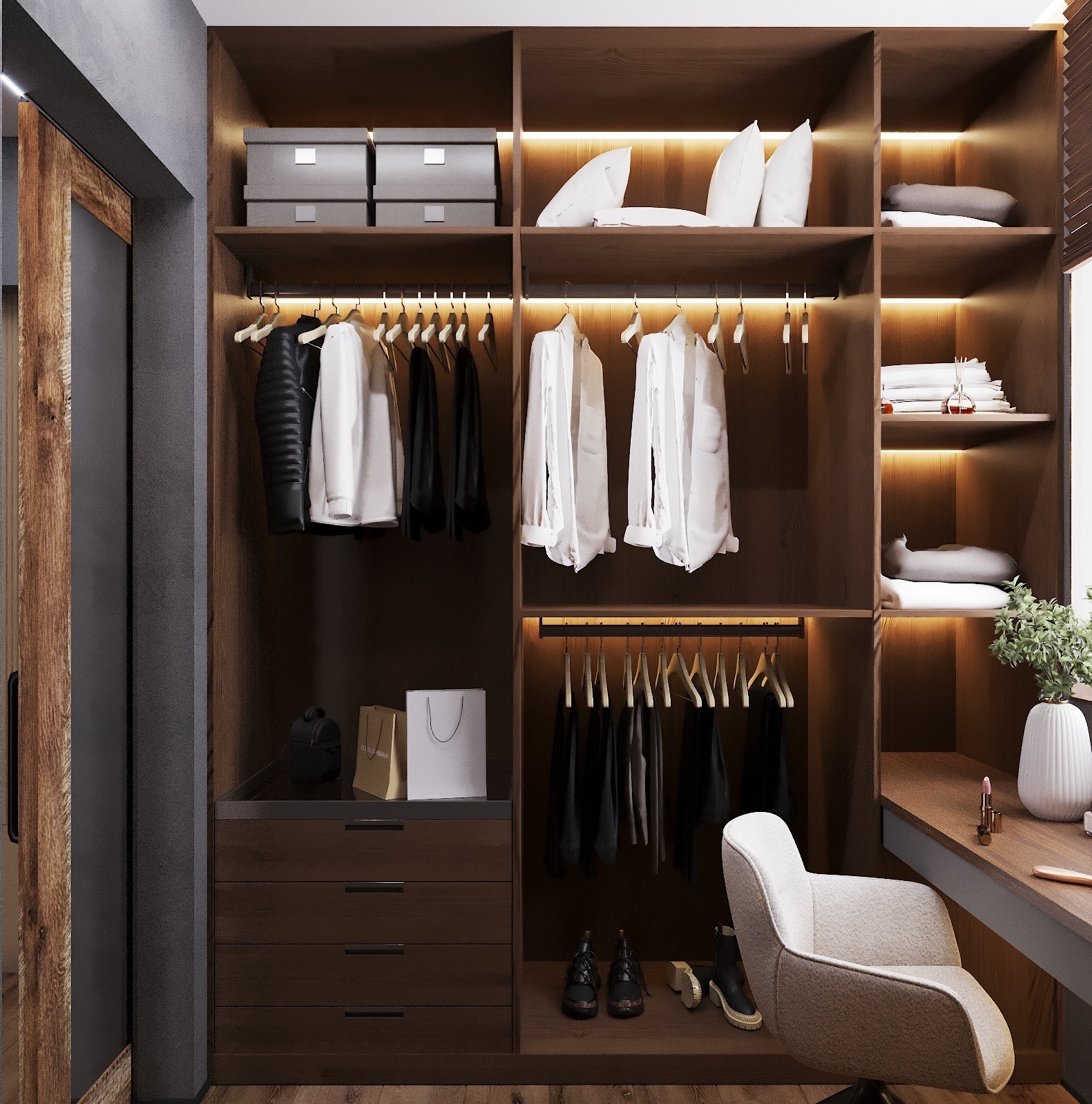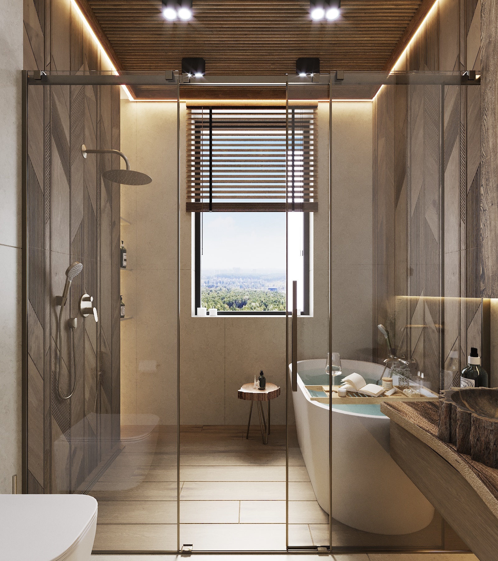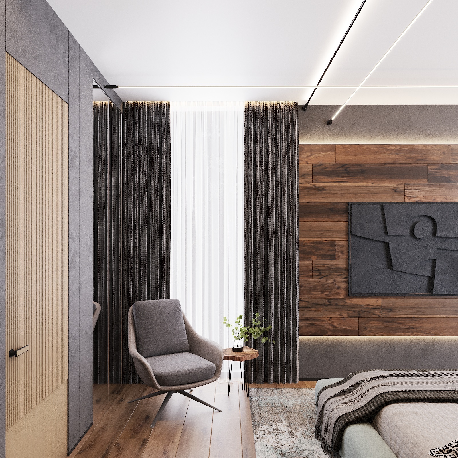 Кухня, гостиная, ванная, душевая с сауной, кабинет, коридор, 2 спальни, гардеробная